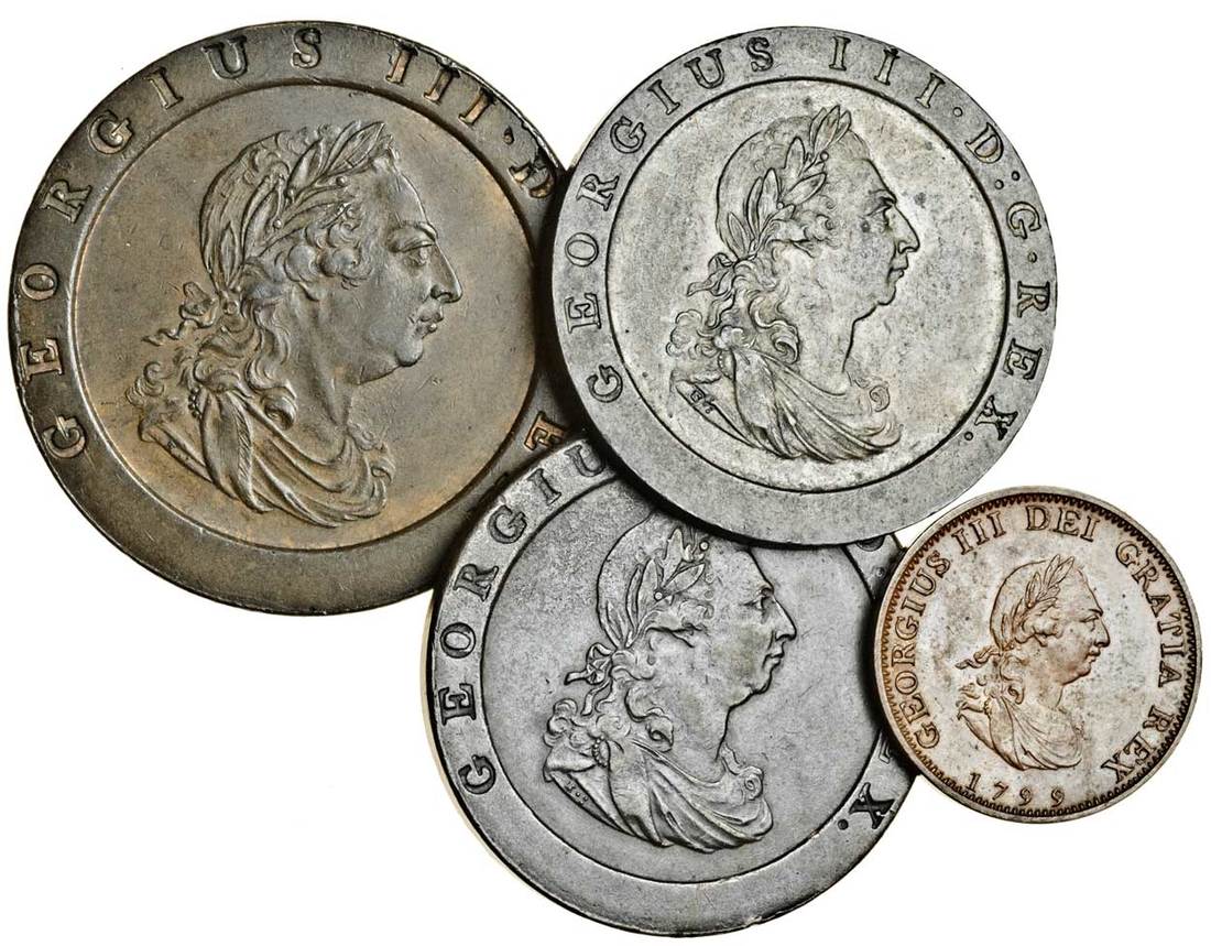 George III (1760-1820), Twopence, 1797, Pennies (2), 1797, and Farthing, 1799, (S.3776, 3777 and 3779), very fine and better, the last extremely fine (4)