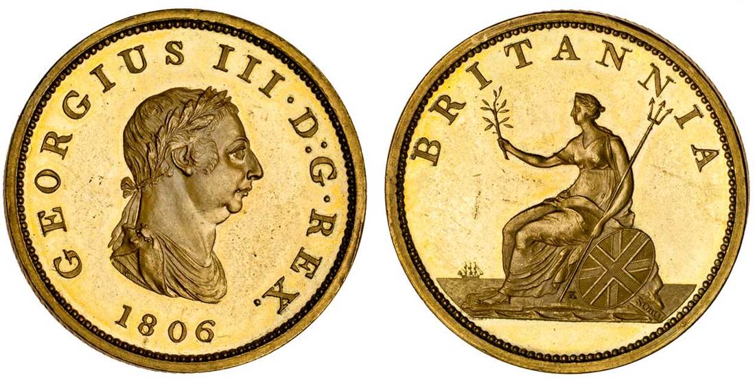 George III (1760-1820), proof gilt Halfpenny, 1806 (late Soho), by C H Küchler, draped and laureate bust right, rev. en médaille, Britannia seated left, edge centre obliquely grained (Peck 1362), extremely fine