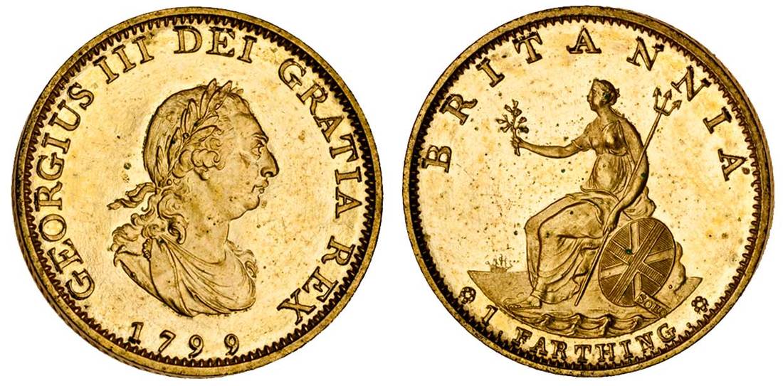 George III (1760-1820), proof gilt Farthing, 1799 (late Soho), by C H Küchler, laureate and draped bust right, rev. inverted die axis, Britannia seated left, edge centre obliquely grained (Peck 1272), extremely fine, rare
