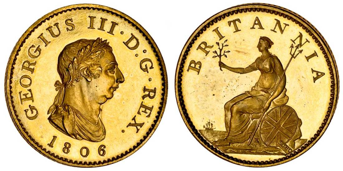 George III (1760-1820), proof gilt Farthing, 1806 (late Soho), by C H Küchler, draped and laureate bust right, rev. inverted die axis, Britannia seated left, edge centre obliquely grained (as Peck 1396, not listed in gilt), extremely fine