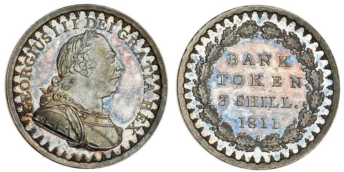 George III (1760-1820), proof Bank of England Token Three Shillings, 1811, laureate and cuirassed bust right, front leaf between d-e, rev. value in wreath with 27 acorns, plain edge (ESC 409A - R4; S.3769), attractively toned, lustrous, uncirculated, rare