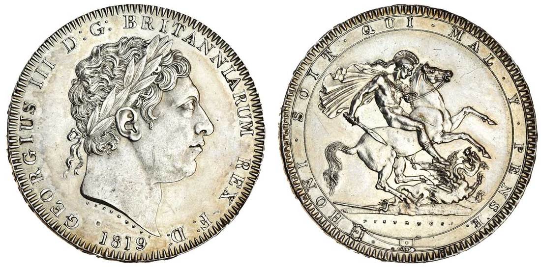 (x) George III (1760-1820), Crown, 1819 lix, laureate head right, rev. St George and dragon (ESC 215; S.3787), small edge knock at x of rex, lightly brushed, extremely fine
