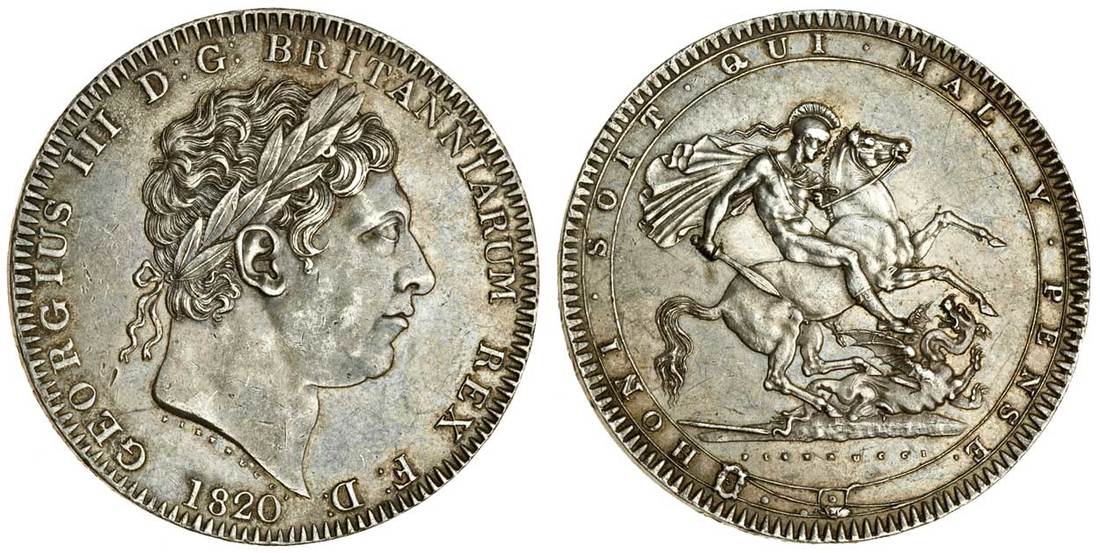 George III (1760-1820), Crown, 1820 lx, laureate head right, rev. St George and dragon (ESC 219; S.3787), some lustre under light grey tone, extremely fine