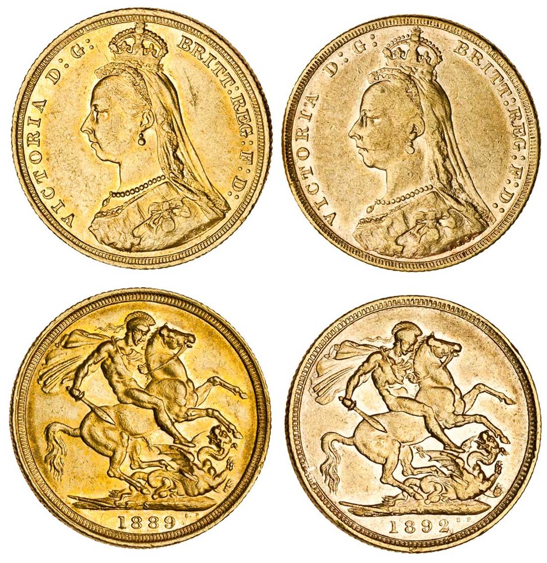 (g) Victoria (1837-1901), Sovereigns (2), 1889 S, 1892 M, Jubilee head left, rev. St. George (S.3867 C, 3868), extremely fine and very fine (2)