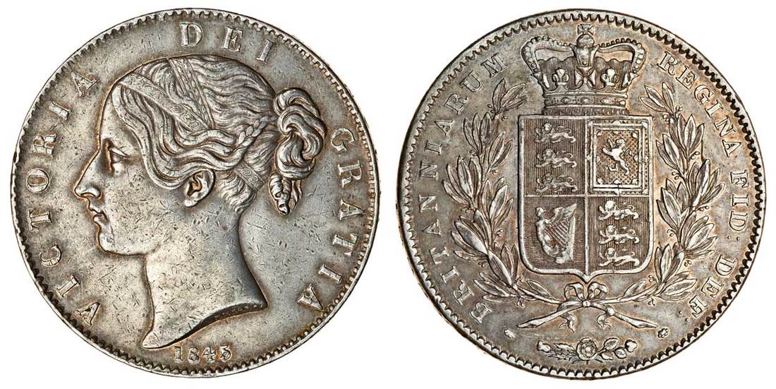 Victoria (1837-1901), Crown, 1845 viii, young head left, rev. crowned shield, cinquefoil stops (ESC 282; S.3882), very fine