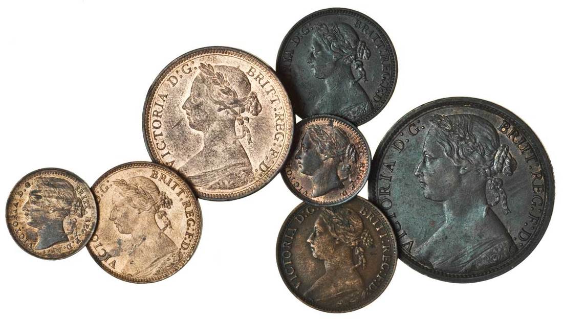 Victoria (1837-1901), AE Penny, 1874 (dies 7-G), Halfpenny, 1887, Farthings (3), 1875H, 1886, 1893, Third-Farthings (2), 1866, 1885 (S.3954, 3956, 3958, 3959, 3960), the Halfpenny, 1893 Farthing and the 1885 Third-Farthing about uncirculated with lustre, others good very fine (7)