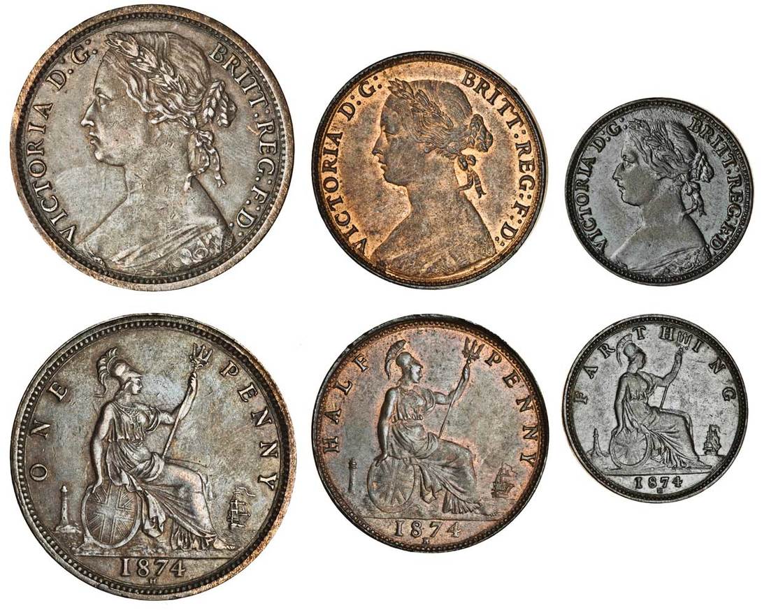 Victoria (1837-1901), Penny, Halfpenny, and Farthing, all 1874 H (Peck 1697, 1806, 1887; S.3955, 3957, 3959), good very fine, extremely fine with some lustre, and very fine, and another Penny, 1881 H, flaw on obverse otherwise about extremely fine (4)