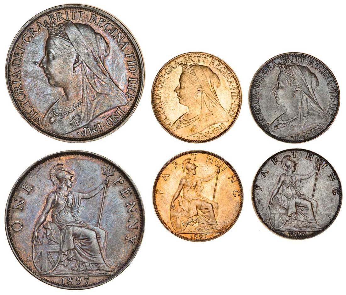 Victoria (1837-1901), Penny, 1897 (Peck 1943; S.3961), and Farthings (2), both 1897, one bright finish (Peck 1961; S.3963), the other dark finish (Peck 1962; S.3964), first about extremely fine, second uncirculated and with lustre, the third extrmely fine (3)
