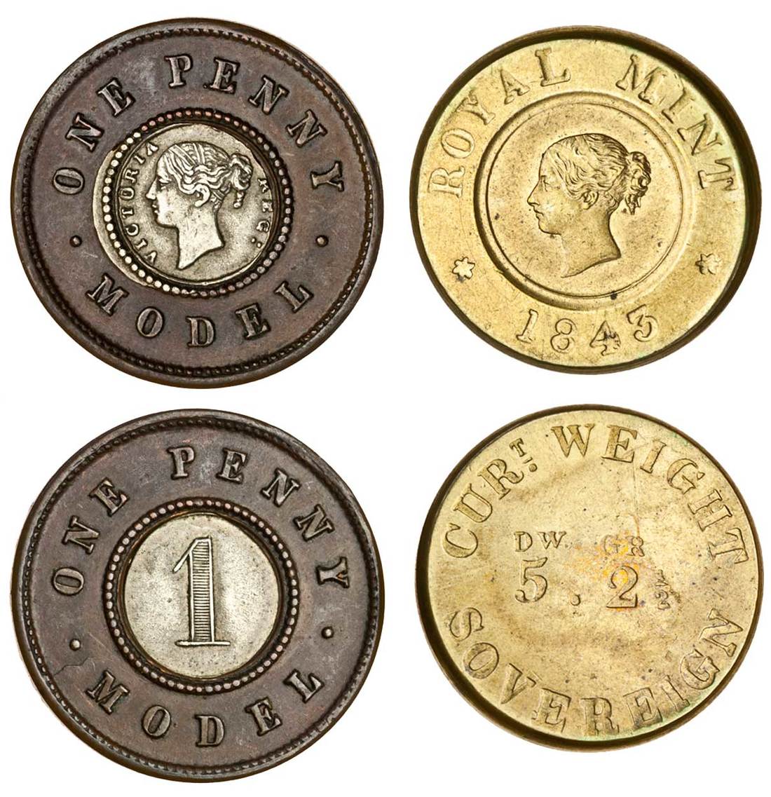 Victoria (1837-1901), bimetallic Model Penny token, undated, brass Royal Mint sovereign coin weight, 1843, extremely fine (2)