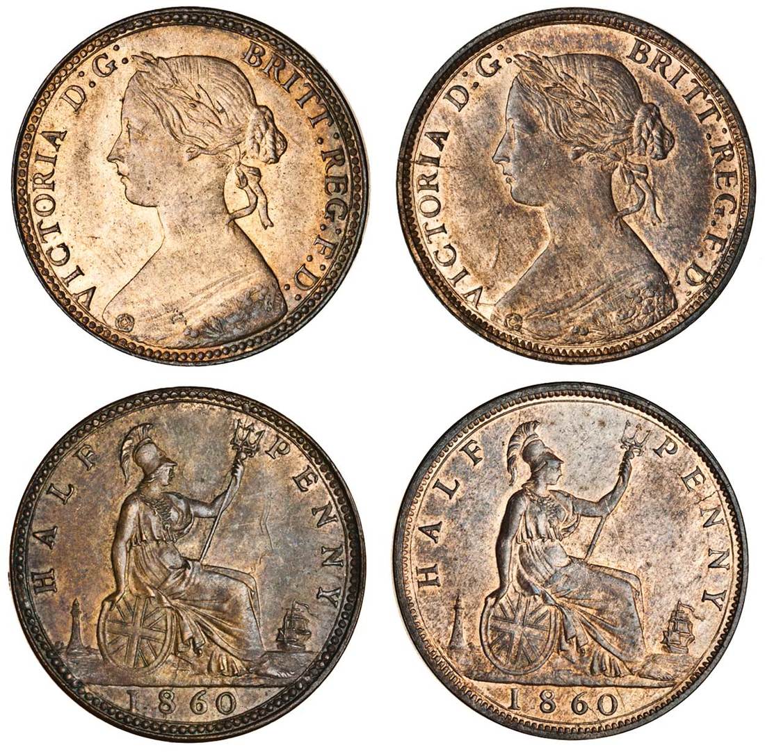 Victoria (1837-1901), Halfpennies (2), both 1860, beaded border (Peck 1750; S.3956), and toothed border (Peck 1754; S.3956), good extremely fine with some lustre (2)