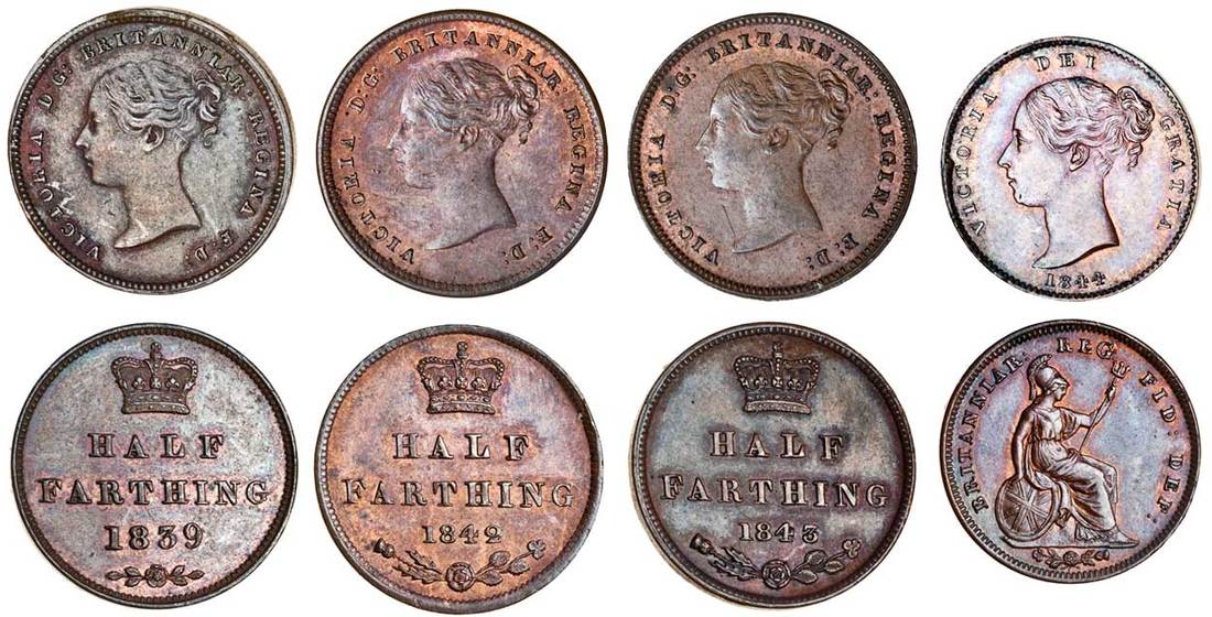 Victoria (1837-1901), AE Half-Farthings (3), 1839, 1842, 1843, Third-Farthing, 1844, young head (S.3951, 3952), generally extremely fine, some with traces of red lustre (4)