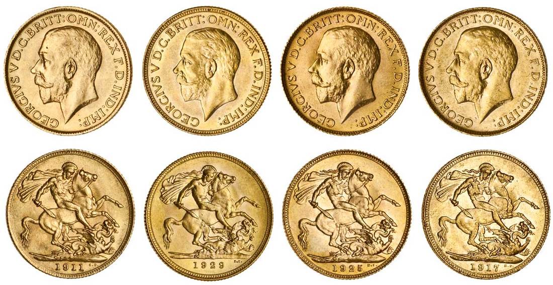 George V (1910-36), Sovereigns (4), 1911, 1917 P, 1925, and 1929 SA (S.3996, 4001, 4005), extremely fine (4)