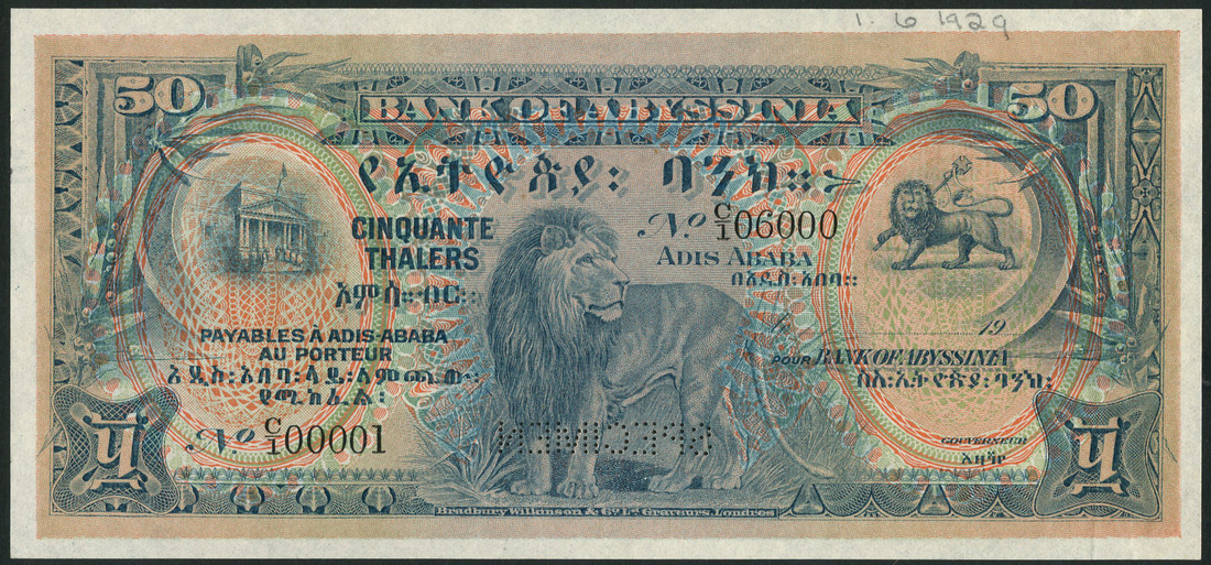 (†) Bank of Abyssinia, printer's archival specimen 50 Thalers, Addis Ababa, 19--, serial number run C/1 00001 to C/1 06000, no signatures, slate-blue on multicoloured underprint, lion at centre, bank building at upper left, Lion of Judah at upper right, reverse brown and pink on pale green and yellow underprint, value at centre, palm fronds and guilloches at left and right, perforated SPECIMEN
