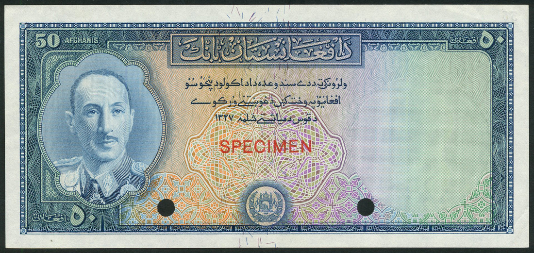 (†) Da Afghanistan Bank, specimen colour trial 20 Afghanis, violet and specimen colour trial 50 Afghanis, blue-green, both SH 1327 (1948), no serial numbers, no signatures, both, King Muhammad Zahir (second portrait) at left, arms at lower centre, the first reverse Victory Arch, Kabul, the second reverse Minar-l-Istiqlal (independence Monument) in Kabul, both overprinted SPECIMEN in red on obverse and reverse, two punch holes