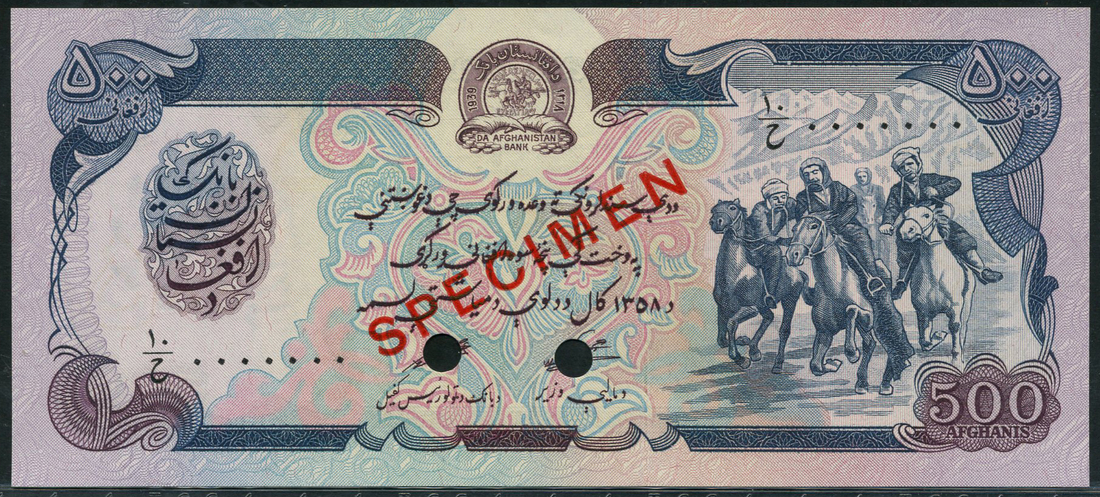 (x) Da Afghanistan Bank, specimen 500 afghanis, ND (1981), zero serial numbers, dark blue on multicolour underprint, horsemen at right, arms at top centre, red SPECIMEN overprint, two cancellation holes