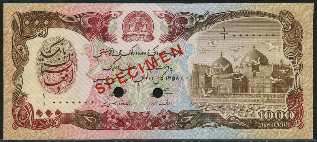 (x) Da Afghanistan Bank, specimen 1000 afghanis, ND (1981), zero serial numbers, brown and red on multicolour underprint, mosque and doves at right, arms at top centre, red SPECIMEN overprint, two cancellation holes