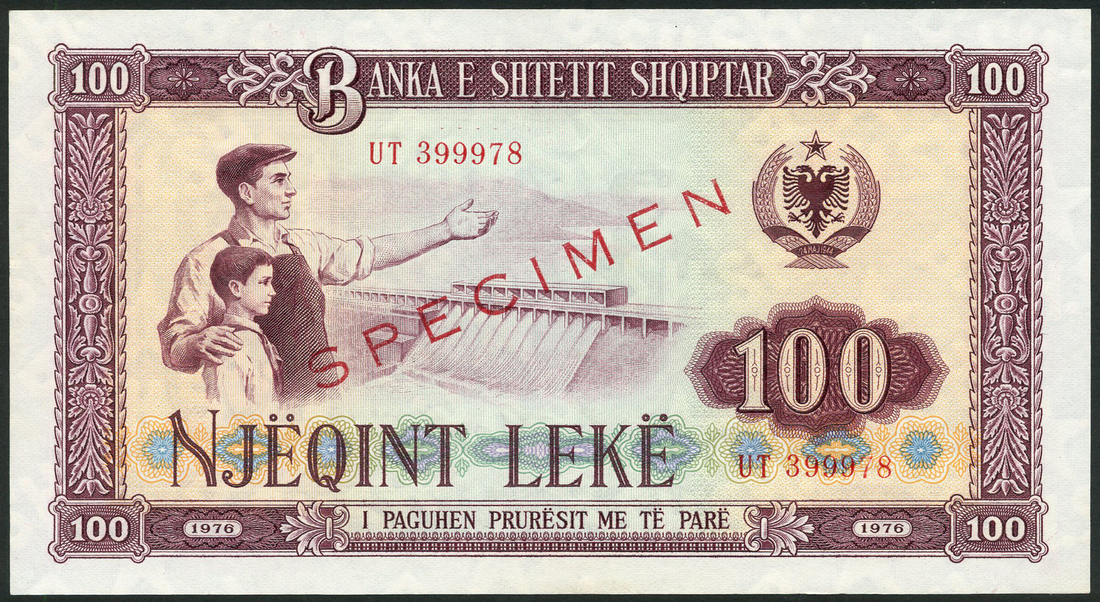 Banka e Shtetit Shqiptar, Albania, a group of notes from the 1976 issue comprising, 1 lek (2, one a specimen), serial numbers BV 193320 and CL 78457, 3 lek, serial number BB 833582, specimen 5 lek, serial number SX 075655, specimen 10 lek, serial number HL564172, specimen 25 lek, serial number YN056099, specimen 50 lek, serial number GS345327 and specimen 100 lek, serial number UT 399978