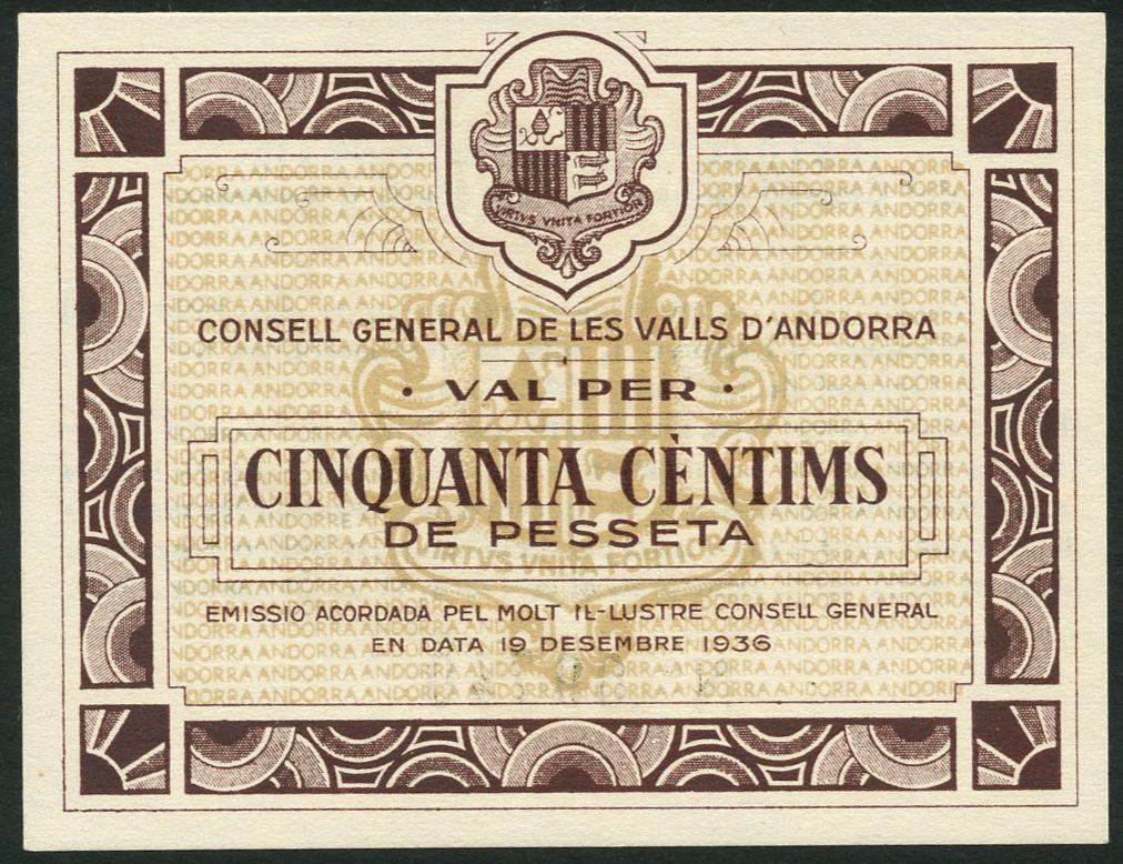 (x) Conseil General, Andorra, 50 centims, 1936, brown and pale brown, arms top centre, reverse text in pale blue