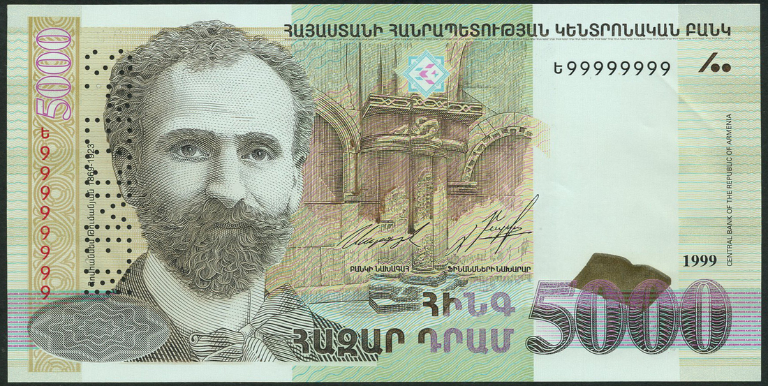 Central Bank of the Republic of Armenia, 5000 dram, 1999, serial number t99999999, plastic experimental note, green and brown, Hovhannes Tumanyan at left, reverse Lory mountains, perforated SPECIMEN