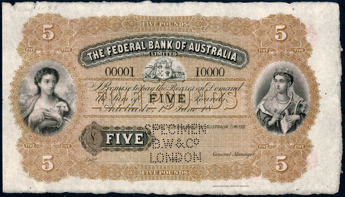 Federal Bank of Australia, printers archival specimen £5, 1 June 18-, serial number 00001-10000, black on brown underprint, shepherdess with lamb at left, turreted maiden with map and calipers at right, arms at top centre, reverse red and green, value at centre, left and right, perforated SPECIMEN B.W&Co LONDON