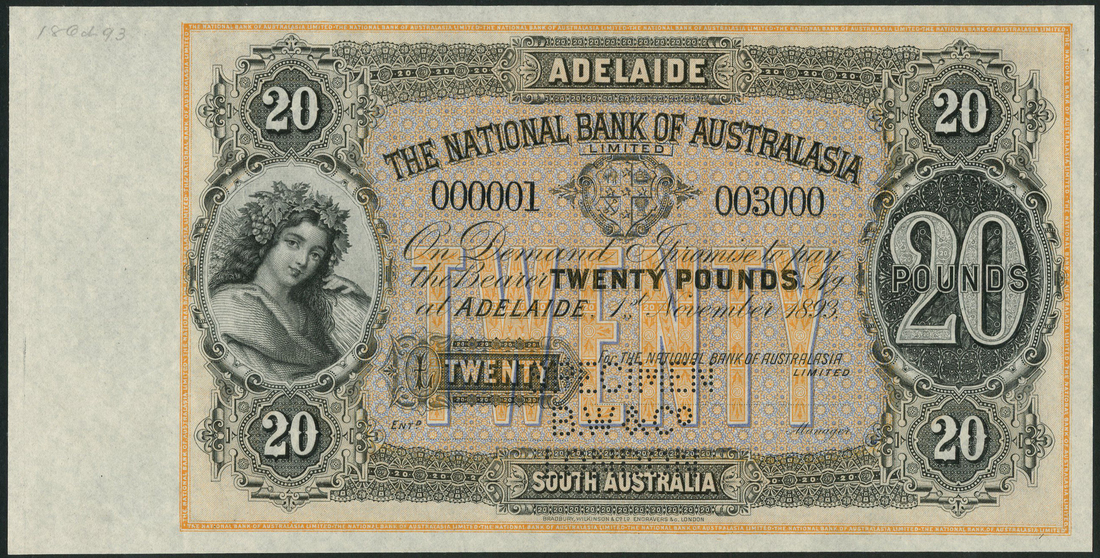(†) National Bank of Australasia Limited, printer's archival specimen £20, Adelaide, 1 November 1893, serial number run 000001 to 003000, black on blue and orange underprint, Ceres at left, value at right, reverse blue and orange, value at centre and in guilloches in each corner, medallic female heads at left and right