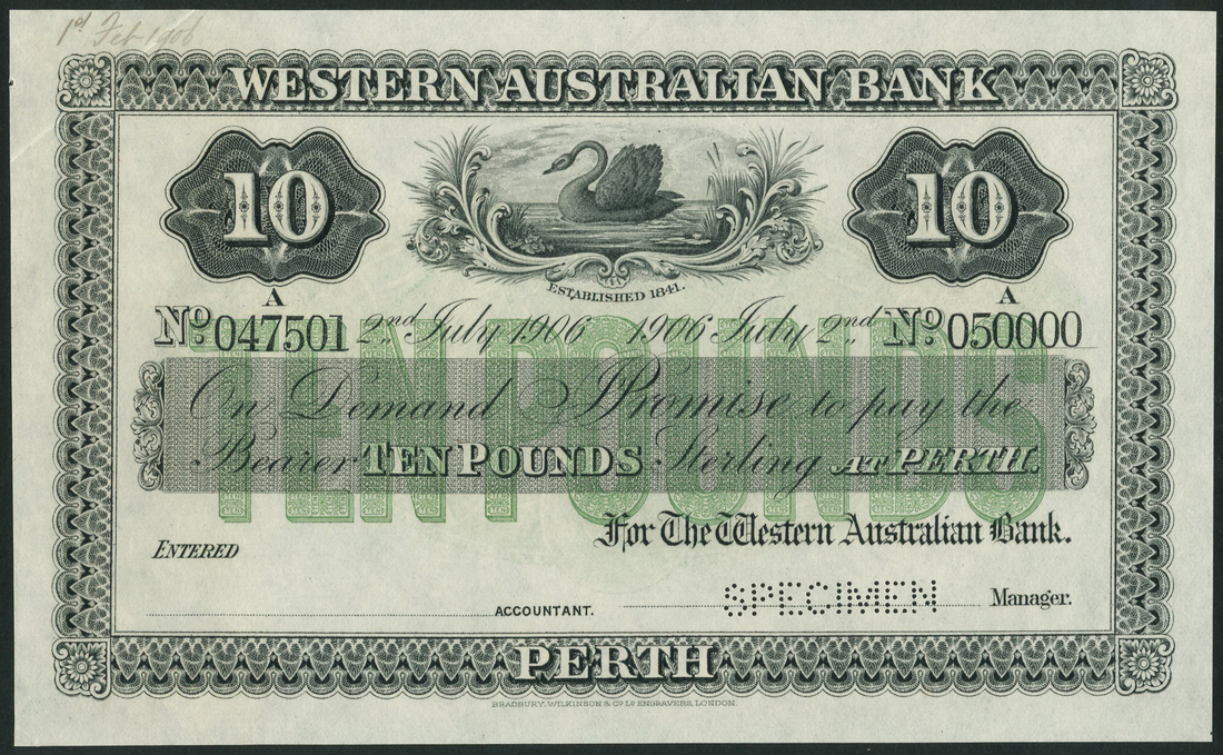 (†) Western Australian Bank, printer's archival specimen £10, Perth, 2 July 1906, serial number run A047501 to A050000, black, white and green, vignette of black swan set in acanthus leaves at upper centre, value on either side, ornately engraved borders, reverse green, value in words and figures set in three ornate guilloches