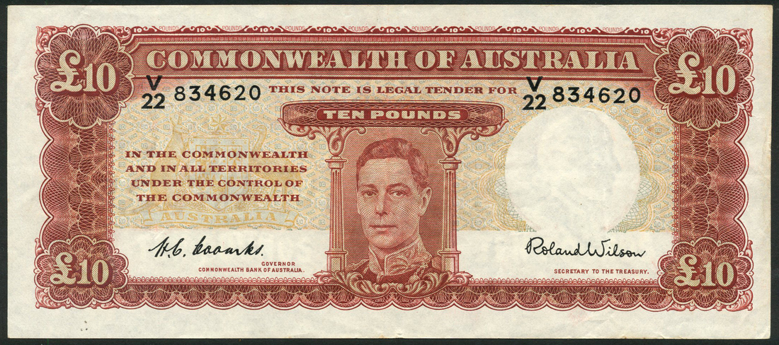 (x) Commonwealth of Australia, £10, ND (1952), serial number V/22 834620, red-brown on multicolour underprint, George VI at centre, value at each corner, reverse red-brown, frieze showing agriculture at top right, Coombs-Wilson signature