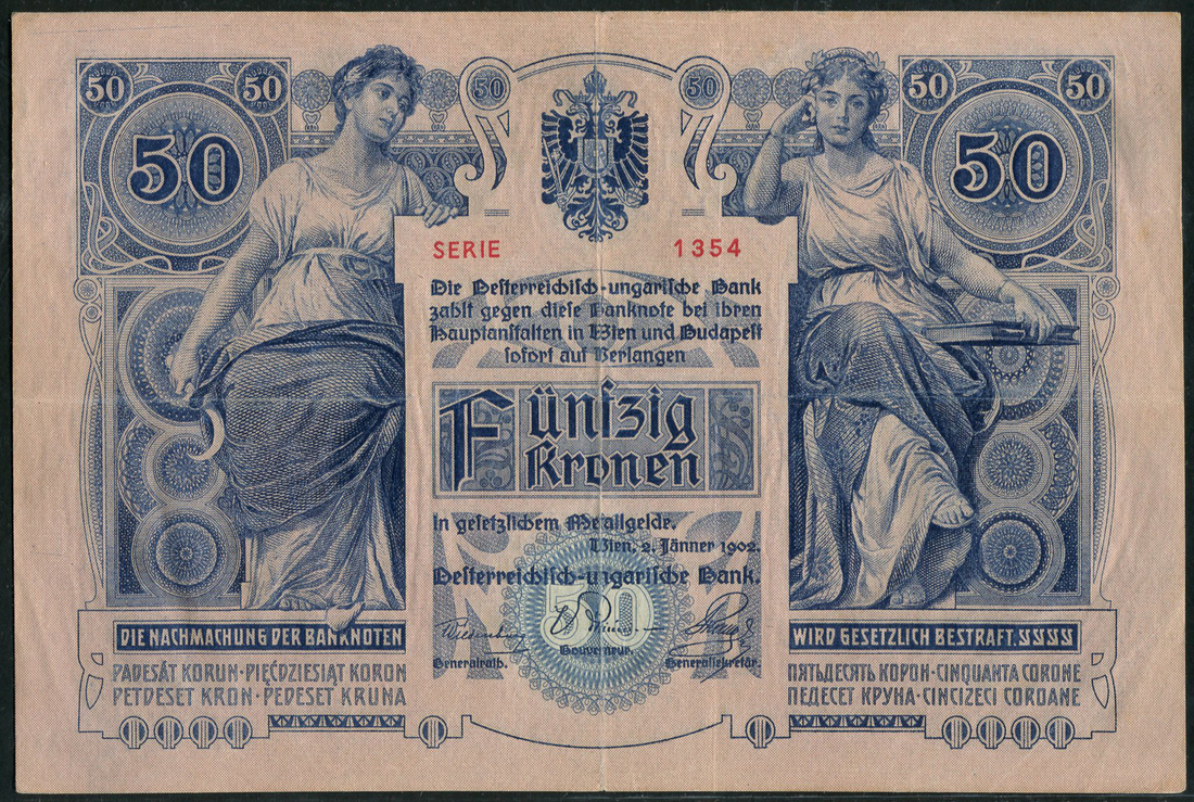 Austro-Hungarian Bank, 50 kronen, 2 January 1902, series 1354, number 52162, blue on pink paper, allegorical maidens at left and right, arms at top centre