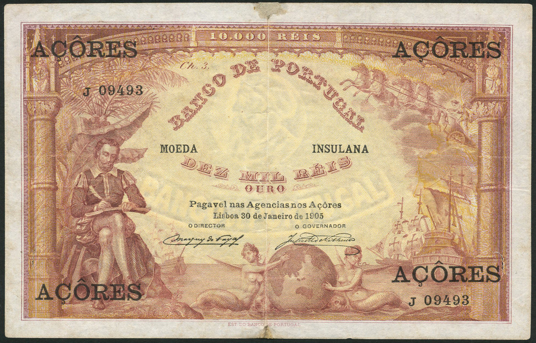 Azores, Banco de Portugal, 10,000 reis ouro, 30 January 1905 (1915), serial number J09493, red on yellow underprint, Camoes at left, mermaids with globe at low centre, sailing ships at right, reverse Henry the Navigator at top left, both sides with several black ACORES overprints