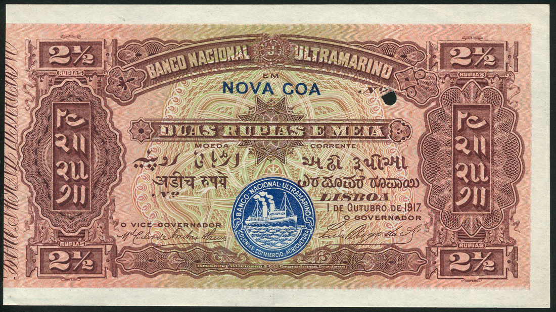 (†) Banco Nacional Ultramarino, Portuguese India, colour trial 2 1/2 rupias, 1 October 1917, no serial numbers, purple and pink, blue NOVA GOA top centre, arms top centre, value at centre and at each corner, blue steamship seal type 3 low centre, Alzina and da Silva signatures, reverse green and pale orange, maiden seated at centre with symbols of commerce and prosperity, value at left and right