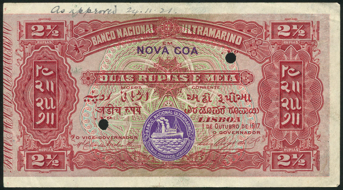 (†) Banco Nacional Ultramarino, Portuguese India, colour trial 2 1/2 rupias, 1 October 1917, no serial numbers, plum red and green and pink, violet NOVA GOA top centre, arms top centre, value at centre and at each corner, violet steamship seal type 3 low centre, Alzina and da Silva signatures, reverse green, maiden seated at centre with symbols of commerce and prosperity, value at left and right