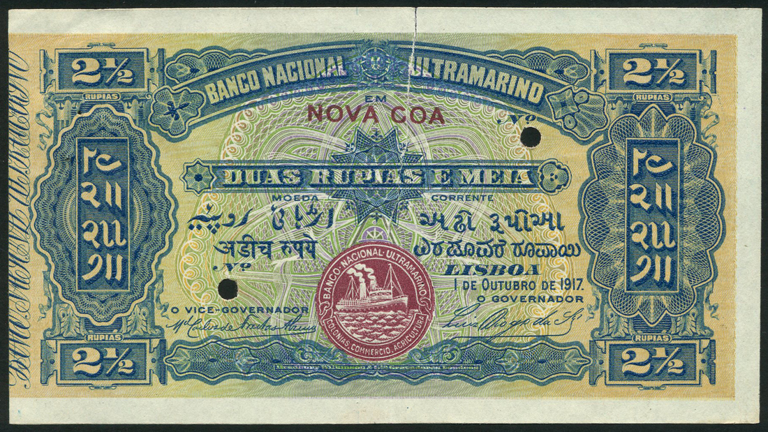 (†) Banco Nacional Ultramarino, Portuguese India, colour trial 2 1/2 rupias, 1 October 1917, no serial numbers, blue and lilac and pale orange, maroon NOVA GOA top centre, arms top centre, value at centre and at each corner, maroon steamship seal type 3 low centre, Alzina and da Silva signatures, reverse brown and pink and pale orange, maiden seated at centre with symbols of commerce and prosperity, value at left and right