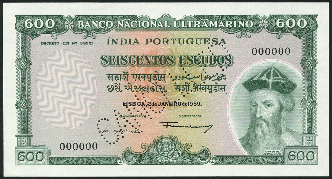 (†) Banco Nacional Ultramarino, Portuguese India, specimen 300 escudos, purple, specimen 600 escudos, green, both 2 January 1959, zero serial numbers, both Afonso de Albuquerque at right, arms low centre, reverse galleons