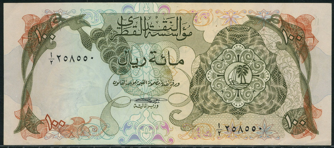 Qatar Monetary Agency, 100 riyals, ND (1973), serial number I/2 258550, olive green on multicolour underprint, dhow and palm tree at right, value at each corner, reverse olive green, Ministry of Finance building at left