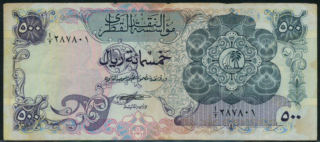 Qatar Monetary Agency, 500 riyals, ND (1973), serial number I/2 287801, purple and dark teal on multicolour underprint, dhow and palm tree at right, value at each corner, reverse dark teal, Mosque of the Sheikhs at left