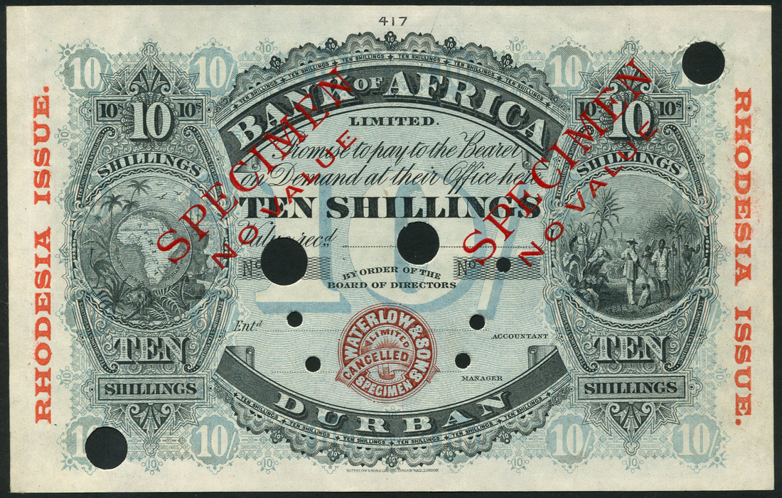 Bank of Africa, Rhodesia issue, colour trial 10/-, Durban, ND (1901), no serial numbers, black on pale blue underprint, map of Africa with lion, ostrich and ships at left, farmers at right, red RHODESIA ISSUE. overprints in left and right margins, reverse green, several cancellation holes of various sizes, red SPECIMEN NO VALUE overprints and red WATERLOW & SONS roundel