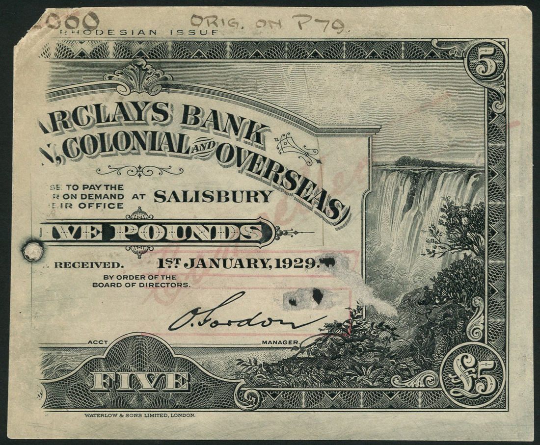Barclays Bank (Dominion, Colonial and Overseas), Rhodesian issue, a partial die proof for £5, Salisbury, 1 January 1929, black, falls at right, value at top left and right, CANCELLED in red ink at centre