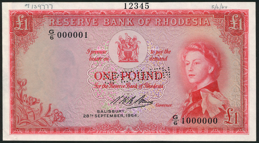 Reserve Bank of Rhodesia, printer's archival specimen £1 (2), 28 September 1964 and 5 October 1964, serial number runs G/6 000001 to G/6 1000000 and G/7 000001 to G/7 1000000 respectively, both signature Bruce, red on multicoloured underprint, portrait of Queen Elizabeth II at right, arms at upper centre, reverse Victoria Falls, perforated SPECIMEN