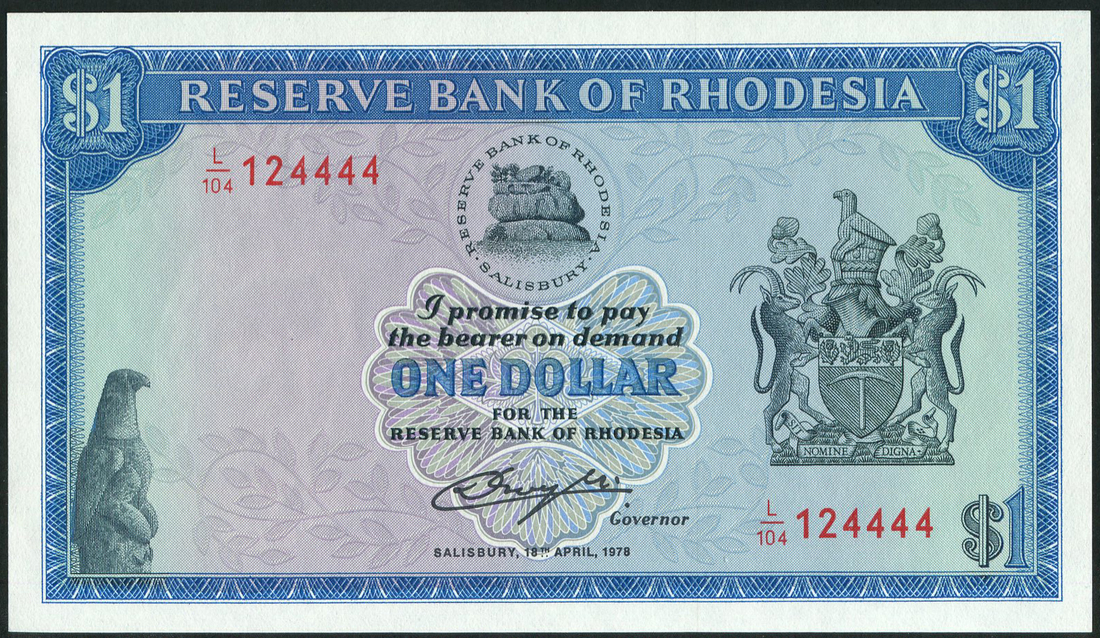 Reserve Bank of Rhodesia, $1, 18 April 1978, prefixes L/104 (2), L/107 (2), 2 August 1979 prefix L/125 blue, coat of arms at right, Cecil Rhodes in watermark at left, reverse tobacco fields