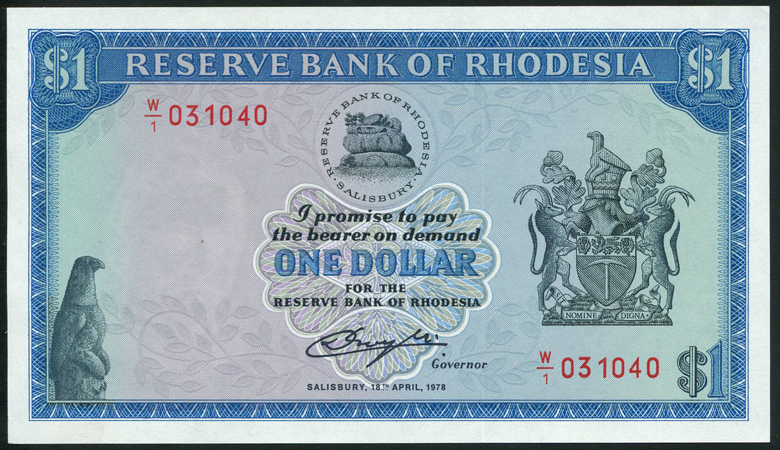 Reserve Bank of Rhodesia, $1 (10), 18 April 1978, all prefix W/1, blue on lilac and pale green, arms at right, value top left and right, centre and low right, reverse, tobacco field