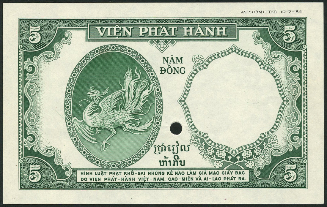 (†) Institut D'Emission des Etats du Cambodge, du Laos et du Vietnam, a proof experimental reverse for the Vietnam issue of the 5 piastres/5 dong, ND (1954), green and white, mythical bird (phoenix?) at left centre, VIEN PH'AT HANH at top