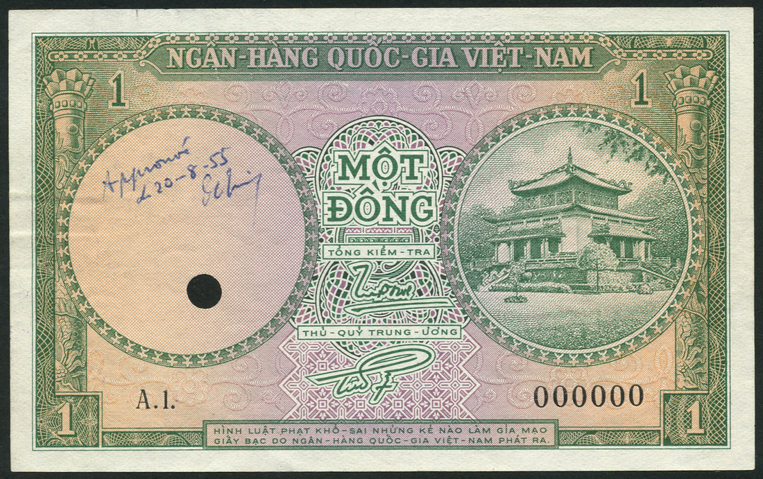 (†) National Bank of Vietnam, specimen 1 dong, ND (1956), serial number A.1 000000, green and pale orange and lilac, temple at right, signatures of Nguyen Van Dong and Tu Van Quy, reverse green, trees and temple