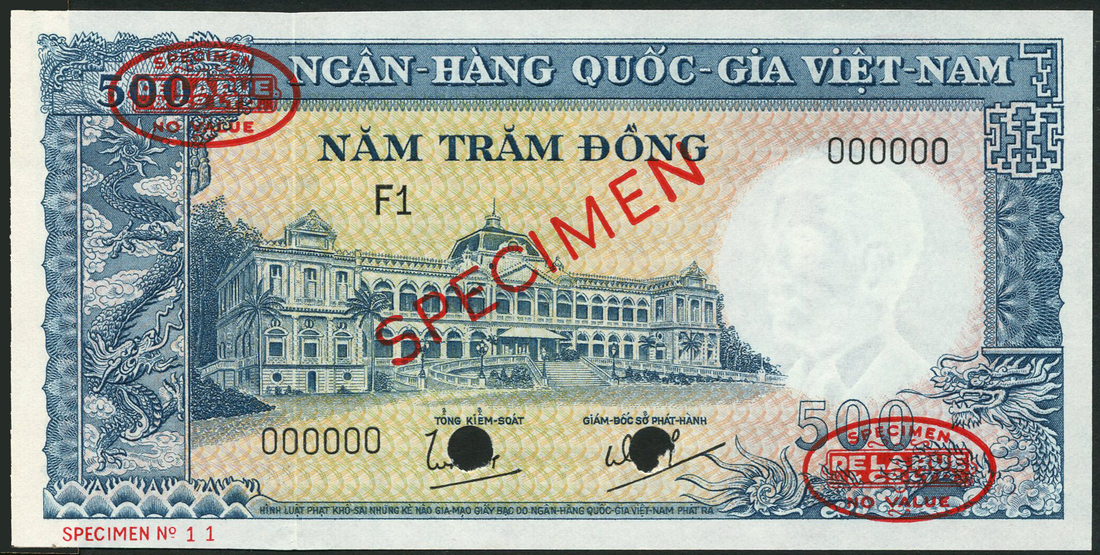 (†) National Bank of Vietnam, specimen 500 Dong, ND (1962), serial number F1 000000, bluish green on gold and pink underprint, Norodom Palace at centre, dragon at left and lower right, signatures of Tong-Kiem-Soat and Giam-Doc So Phat-Hanh, reverse blue and green, farmer with two water buffalo,