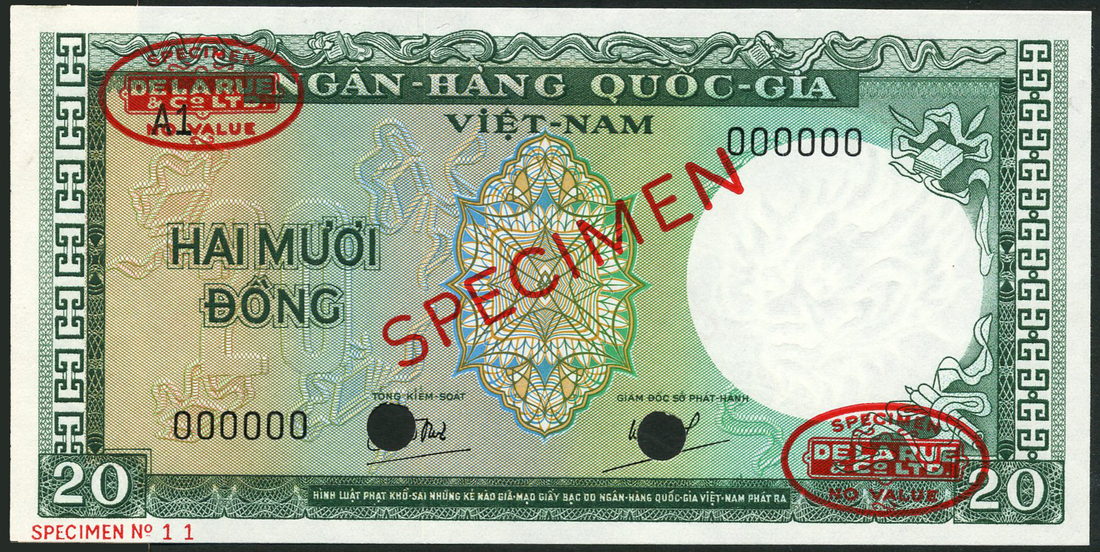 (†) National Bank of Vietnam, specimen 20 dong, ND (1964), serial number A1 000000, green and multicoloured, value at left and right, printed signatures of Tong-Kiem-Soat and Giam-Doc Phat Hanh low right, reverse green and russet, fish at centre, value at left and right