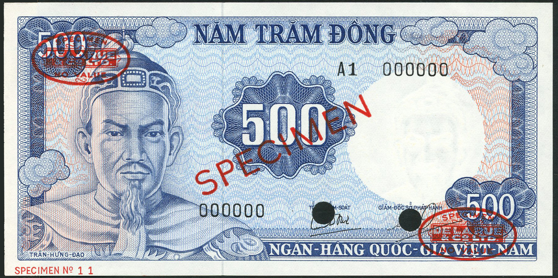 (†) National Bank of Vietnam, specimen 500 dong, ND (1964), serial A1 000000, blue and pale pink, Tran Hung Dao at left, value at centre, Tong-Kiem-Soat and Giam-Doc So Phat-Hanh signatures low centre, reverse blue and pale green, warship and rocks