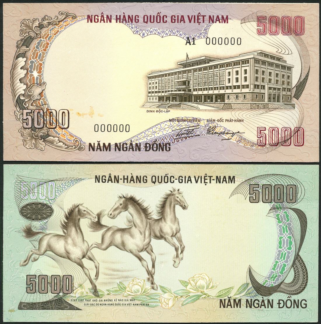 (†) National Bank of Vietnam, South Vietnam, a printers composite obverse and reverse archival essay on card for a 5000 dong, ND (ca 1972), serial number A1 000000, mauve and multicoloured, the Palace of Independence at right, value at left and right, printed signatures low right, reverse brown and pale green, three horses at left, value at left and right