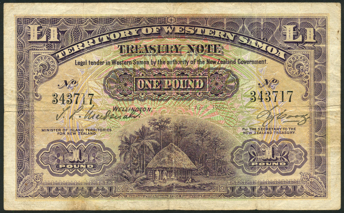 (x) Territory of Western Samoa, £1, 1 April 1958, serial number 343717, mauve on multicolour underprint, thatched village hut low centre, reverse, light brown, pink and blue