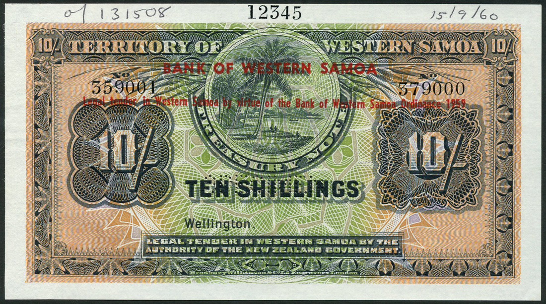 (†) Territory of Western Samoa, printer's archival specimen 10 Shillings, Wellington, ND (1960-61), Provisional Issue, serial number run 359001 to 379000, no signatures, black on brown and green underprint, palm tree and beach scene at upper centre, value at left and right, overprinted in red on obverse and reverse BANK OF WESTERN SAMOA / Legal tender in Western Samoa by virtue of the Bank of Western Samoa Ordnance 1959, reverse value in ornate guilloches, perforated SPECIMEN
