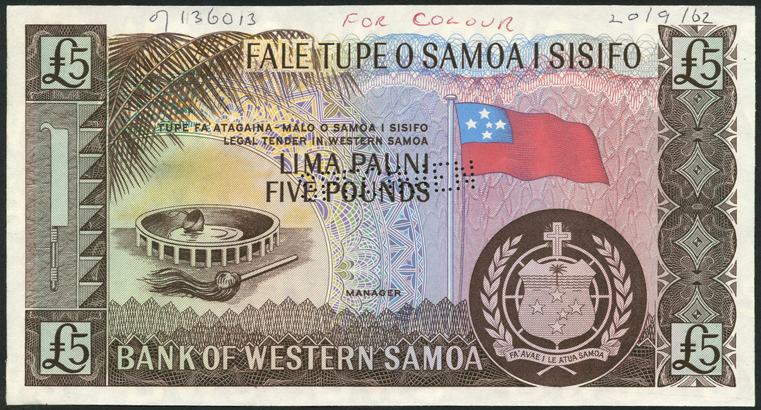 (†) Bank of Western Samoa, specimen proof £5, no serial numbers, no signatures; printer's archival specimen £5, serial run 000001 to 050000, both ND (1963), brown and multicoloured, rava bowl at left, flag at centre right, arms at lower right, reverse shoreline with trees and islands, perforated SPECIMEN