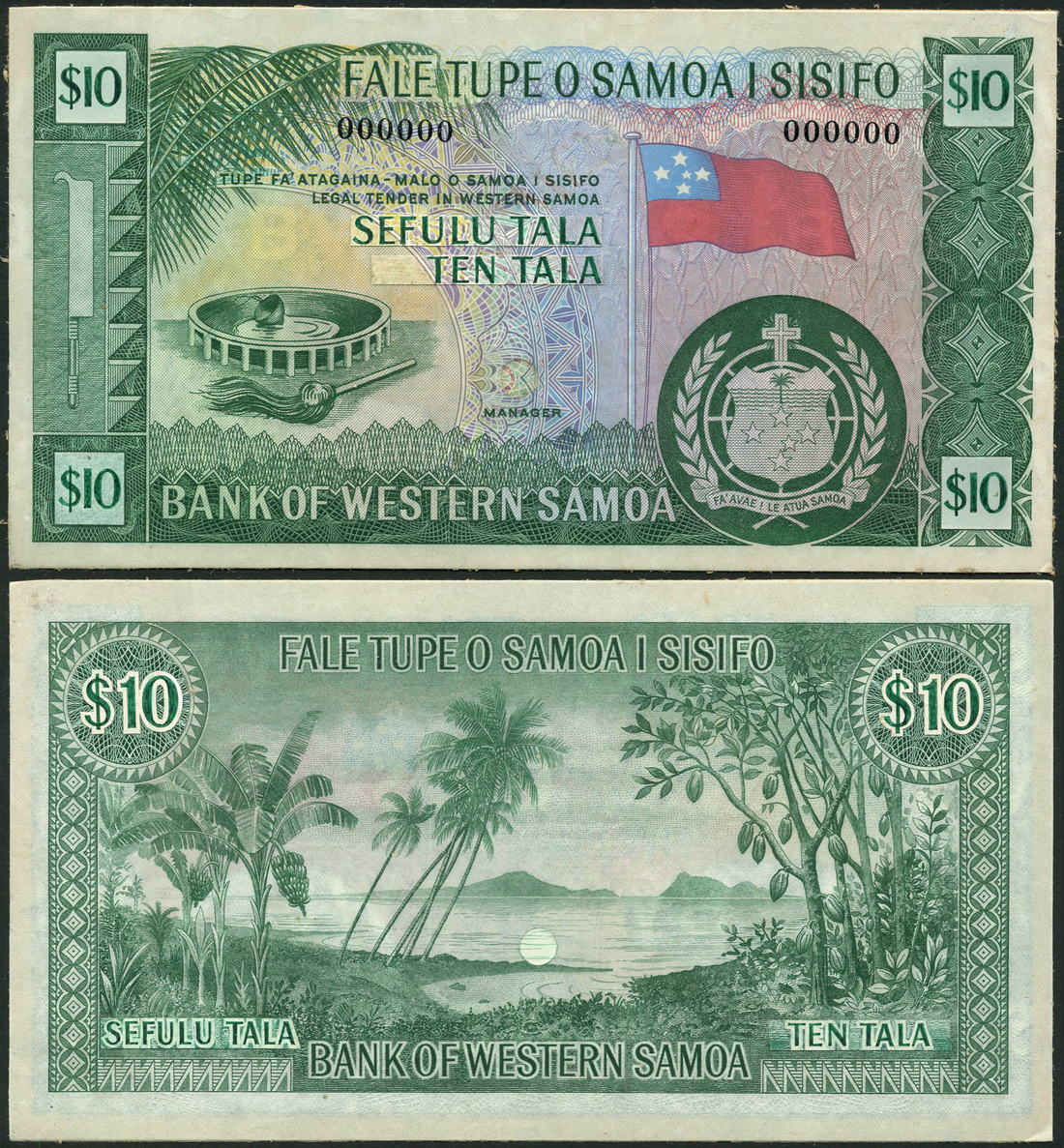 Bank of Western Samoa, obverse and reverse composite essay on card for 10 Tala, ND (ca 1967), serial number 000000, green, pink and blue on multicoloured underprint, tava bowl at left, flag at centre right, arms at lower right, value in each corner, reverse shoreline with palm and banana trees, one punch hole
